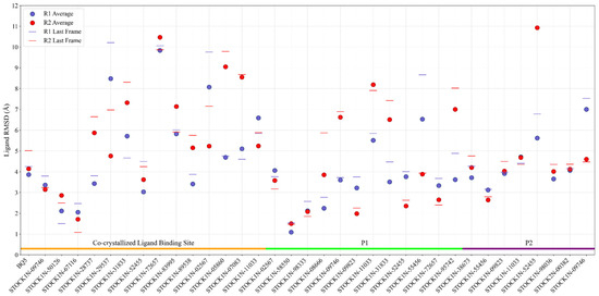 The RMSD results from MD simulations of 34 hit compounds were analyzed for both the receptor and ligand (Figure 2). Compounds with an average RMSD value greater than 5 Å that either escaped from the defined binding site or failed to interact with residues known to play a role in binding within the cavity were excluded from further analysis without calculating their thermal MM-GBSA values. Consequently, based on the MD simulations, 4 compounds for the known binding site, 4 compounds for P1, and 5 compounds for P2 were selected for further analysis (Figure 3).