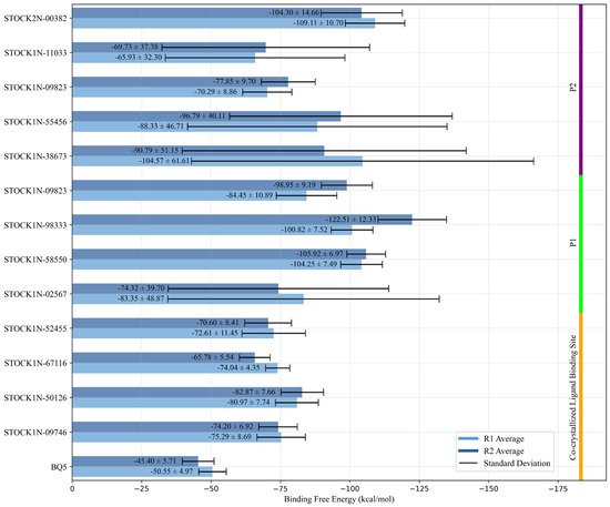 Among the structures selected for the P2 pocket, a higher standard deviation of the binding free energies was observed for compounds STOCK1N-55456, STOCK1N-38673, and STOCK1N-11033 (Figure 3). Although all of the compounds interact with the hub residue R41, they appear to interact to a lesser extent with the other residues of the pocket, except for STOCK1N-55456 (Figures S23–S32). These large compounds with many degrees of freedom may have various conformational changes while trying to fit into the binding site. It is possible that peripheral water molecules may occupy critical locations within the binding site, thereby impeding the ligand’s ability to fully engage with the binding site of the target protein. This may result in significant deviations in the calculated thermal MM-GBSA binding energies [65]. The indole derivative, STOCK2N-00382 with hydrogen bond donor amine groups forms hydrogen bonds with D620, E966, E970 and R41 during the MD simulations, while it has hydrophobic interactions through its aromatic ring with the hub residue R41 (Figures S30 and S31) which lead to a better binding energy (−109.11 ± 10.70 for R1 and −104.30 ± 14.66 for R2) than the other pocket P2 compounds. In fact, indole-derived compounds targeting SOS1-mediated RAS signaling present a promising avenue for investigating RAS modulation in cancer therapy [66].