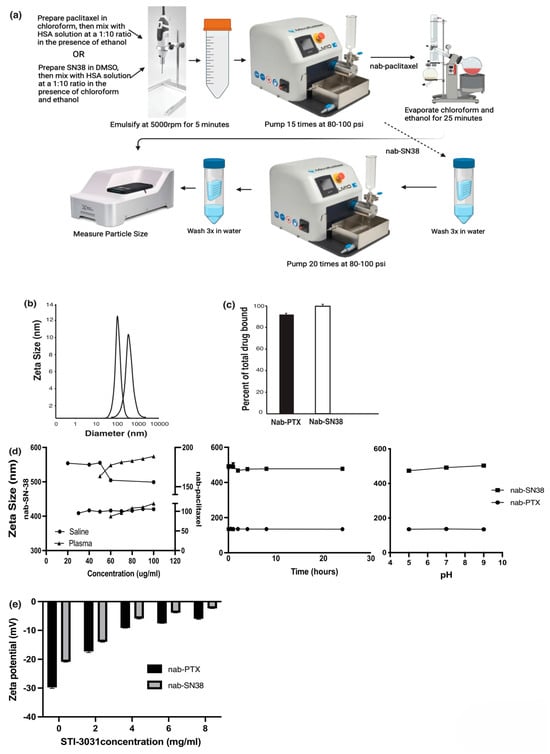 Nanoparticle manufacturing schematic and physiochemical properties of nanoparticles and NIC formation; (a) is a schematic representation of the manufacturing process for nab-PTX and nab-SN38 made in Biorender (b) Nanoparticles were diluted to 100 µg/mL, and their size was determined with a zeta-sizer, and sizes are represented in nm. (c) HPLC was performed to measure the total amount of drug that was bound to the nanoparticles and 90–100% of the 10 mg/mL bound to albumin. (d) Nanoparticles were diluted in saline or simulated plasma from 20 to 100 µg/mL, and the size of the particles was determined with the zeta-sizer (left panel); nanoparticles were diluted in saline at 50 µg/mL, and their stability was determined over time (middle panel) and pH (right panel). (e) STI-3031 was incubated with the nanoparticles in increasing concentration (0–8 mg/mL), and zeta potential was determined with a zeta-sizer.
