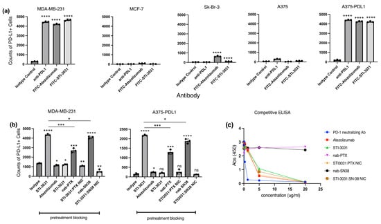 PD-L1 Expression and Ligand Binding: Three breast cancer lines (MDA-MB-231, MCF-7, and Sk-Br-3) and one melanoma line (A375 and PD-L1-transfected A375) were tested for PD-L1 positivity. In addition, an anti-PD-L1 (clone MIH1) flow antibody was compared with alexa fluor 488-conjugated atezolizumab and STI-3031 (Figure 2a). MDA-MB-231 and A375-PDL1 cells were all PD-L1 positive, with anti-PD-L1, atezolizumab, and STI-30331 staining having significantly more PDL1+ cells compared to the isotype control (p-value ≤ 0.0001). MCF-7 and A375 WT were PD-L1 negative (Figure 2a). SK-Br-3 cells had no PD-L1+ cells when stained with the positive control anti-PD-L1 while showing some positivity when stained with atezolizumab and STI-3031 with a p-value of <0.0001 when compared to the isotype control (Figure 2a).