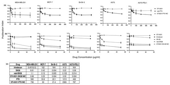 Chemotherapy Drug Toxicity: To test the toxicity of the chemotherapy drugs, PTX and SN-38, both alone and in the context of the nanoparticles, and STI-3031-bound NIC, MDA-MB-231, MCF-7, Sk-Br-3, A375, and A375 PDL1 cell lines were utilized. The cells were exposed to antibody alone (STI-3031), nab-PTX, STI3031:PTX NIC (Figure 3a), irinotecan, free SN-38, nab-SN38, or STI3031:SN38 NIC (Figure 3b). The cells were treated with the drug overnight, and proliferation was assessed by the amount of EdU bound to DNA. STI-3031 alone did not impact proliferation in any of the cell lines tested with the range of EdU+ cells ranging from 91 to 100% of the maximal proliferation in untreated cells. The breast cancer lines showed equivalent reduction of proliferation when treated with both nab-PTX and STI3031:PTX NIC. MDA-MB-231 IC50 were 590 and 736 µg/mL, MCF-7 IC50 were 53.9 and 50 µg/mL, and Sk-Br-3 IC50 were 22.1 and 21.4 µg/mL for nab-PTX and STI3031:PTX NIC, respectively. On the other hand, the melanoma lines, A375 WT and A375-PDL1, were somewhat less sensitive to PTX and STI3031:PTX NIC with an IC50 (1231 and 2365 µg/mL) and (456 and 787 µg/mL), respectively. For testing the toxicity of SN-38 nanoparticles and NIC, free SN-38 and its parent drug, irinotecan, were added as controls. Irinotecan had limited toxicity in MDA-MB-231, Sk-Br-3, and A375-PDL1 cells with an IC50 of 6.4 × 10−5 for MDA-MB-231 cells, while the IC50 for Sk-BR-3 and A375-PDL1 could not be calculated for lack of a dose response. MCF-7 and A375 WT cells were mildly sensitive to irinotecan with an IC50 of 162 and 41.9 µg/mL. All the cell lines tested were sensitive to free-SN-38, nab-SN38, and STI3031:SN38 NIC with IC50 for MDA-MB-231 (6.61, 1.1, and 0.66 µg/mL), MCF-7 (0.42., 0.13, and 0.23 µg/mL), Sk-Br-3 (0.004, 0.005, and 0.004 µg/mL), A375 WT (0.22, 0.103, and 0.33 µg/mL), and A375-PDL1 (0.06, 0.014, and 0.004 µg/mL). IC50 values are presented in Figure 3c and expressed in µg/mL. Interestingly, whether the cells were PD-L1+ (MDA-MB-231 and A375-PDL1), slightly positive (Sk-Br-3), or negative (MCF-7 and A375) did not significantly affect the level of toxicity of the chemotherapy drugs, possibly due to the long exposure to the drugs.