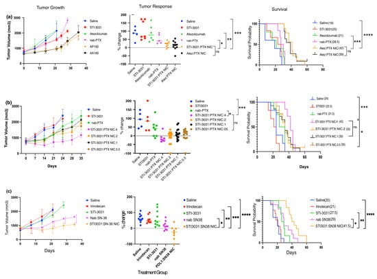 In vivo tumor efficacy: In the first in vivo experiment, nab-PTX was tested against NIC made with STI-3031 or atezolizumab, a clinically approved anti-PD-L1 antibody (Figure 4a). Tumor growth was inhibited most in the NIC groups whether the NIC was made with STI3031 or atezolizumab, as compared to antibody or nab-PTX alone (Figure 4a, left panel). The percent change in tumor size was also calculated (Figure 4a, middle panel). The significance of the tumor size of mice treated with NIC made with STI-3031 was compared to all other individual treatment groups. The difference between the NIC and saline (p = 0.0005) or STI-3031 (p = 0.0008) was highly significant, while the difference between STI3031:PTX NIC and atezolizumab–PTX NIC was slightly less significant (p = 0.0019). The difference between PTX NIC and nab-PTX was also significant (p = 0.025), while the difference between the two NICs was not significant (p = 0.578), suggesting that antibody targeting with STI-3031 is equivalent to clinically approved atezolizumab. Likewise, survival (Figure 4a, right panel) between the PTX NIC (42 days) and saline (19 days) or antibodies (25 days for STI-3031 and 21 days for atezolizumab) were highly significant (p ≤ 0.0001). Additionally, the survival between nab-PTX (28.5 days) and PTX NIC was also significant (p = 0.0003), but the difference in survival between the two NIC groups (42 and 39 days) was not significant (p = 0.839).