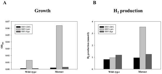 Growth and H2 production of wild-type and mutant GH03. (A) Growth (OD600) on MM1-CMC (carboxymethylcellulose), MM1-Lam (laminarin), and MM1-Aga (agarose). (B) H2 production (mmol/L) under the same culture conditions. Each measurement was performed in duplicate.