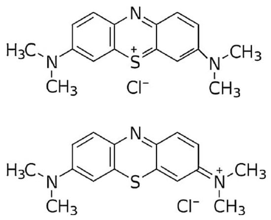 Therefore, this work aimed to study the effect of acid and alkali pretreatment on the biosorption capacity of M. pyrifera to remove recalcitrant organic pollutants from an aqueous solution, as well as its relationship with the physicochemical and structural properties of the seaweed biomass. Methylene blue (MB) was chosen as a model molecule of recalcitrant organic pollutants because it is an organic cationic dye widely used in the textile industry and biotechnological applications [,]. Its resonant structure is presented in Figure 1, demonstrating that the positive charge can be located on one of the amino nitrogen atoms or the sulfur (S) atom. Some characteristics of MB are presented in Table 1 []. The performance of M. pyrifera modified with acid and alkali was studied under different pH values and biosorbent dosages. Kinetic studies were also incorporated to study the adsorption mechanism involved in MB biosorption of M. pyrifera.