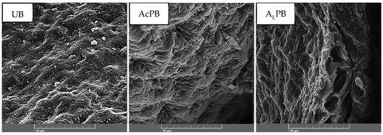 Representative SEM images of untreated (UB), acid-pretreated (ACPB), and alkali-pretreated (ALPB) seaweed biomass.