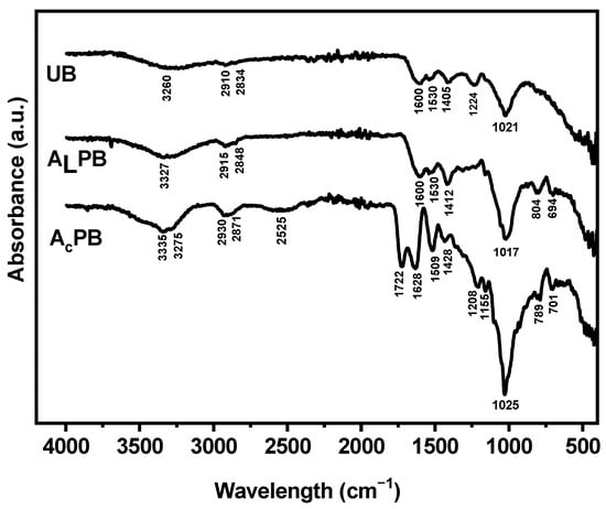 Figure 3 presents the FTIR-ATR spectra for UB, ALPB, and ACPB seaweeds. Typical cell walls of M. pyrifera comprise a fibrillar structure mainly of cellulose and an embedding matrix of alginic acid or alginate (phyco-colloids) with a small amount of sulfated polysaccharides (fucoidans). Additionally, proteins and lipidic components are present, contributing to the overall chemical functionality of the biomass [,,,]. These compounds have active groups such as amine, amide, carboxyl, hydroxyl, sulfhydryl, and sulfonate groups that are responsible for the adsorption process [,,]. The FTIR-ATR spectrum of UB shows a broad band at 3260 cm−1, attributed to N-H stretching vibrations of amino groups (-NH2) and O-H stretching vibrations of hydroxyl groups (-OH), which can be associated with proteins (amino acids) and polysaccharides, respectively [,,,,]. The bands at 2910 cm−1 and 2834 cm−1 correspond to C-H stretching vibrations, with the 2910 cm−1 band primarily attributed to carbohydrates in cellulose and hemicellulose, while the 2834 cm−1 band is associated with C-H stretching in aliphatic chains of lipids [,]. The bands at 1600 cm−1 and 1405 cm−1 are attributed to C=O stretching of carboxylic acids [] and symmetric stretching of carboxylate anions (-COO−) [,], respectively. Additionally, secondary amines (N-H and C-N stretching) are detected at 1530 cm−1 [,]. The band at 1224 cm−1 is attributed to aryl-O stretching aromatic ethers []. The band at 1021 cm−1 corresponds to the C-N stretching of amine groups and C-O stretching vibration of hydroxyl groups from cellulose and hemicellulose [,,,,]. Furthermore, sulfonate groups (-SO3−) are detected in the range of 700-900 cm−1, assigned to S=O and S-O stretching vibrations [,].
