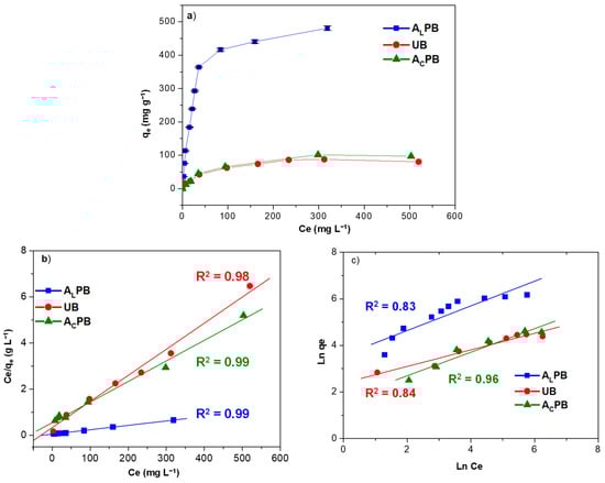 Effect of pretreatment of M. pyrifera in the biosorption of methylene blue at room temperature and pH 7.9: (a) adsorption isotherms; (b) fit of the experimental data to Langmuir isotherm model; (c) fit of the experimental data to Freundlich isotherm model.