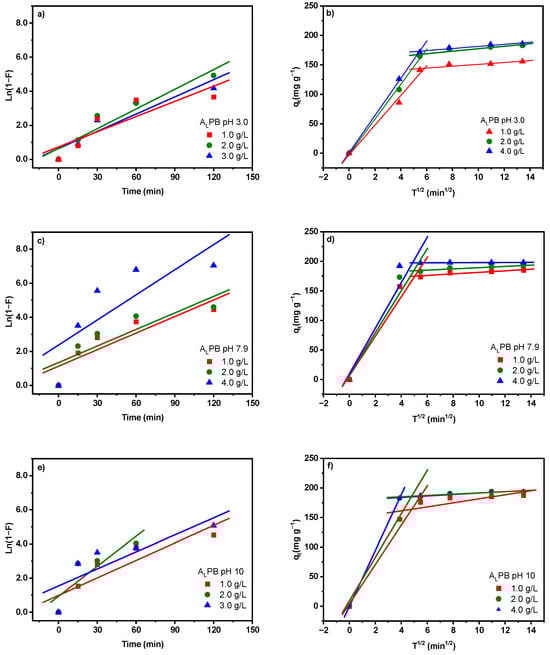 Liquid-film diffusion (a,c,e) and intraparticle diffusion models (b,d,f) of methylene blue biosorption by alkali-pretreated biomass (ALPB) performed at different pHs and 1.0 g L−1 of biomass dosage.