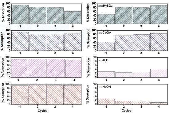The highest percent recovery in the first cycle were observed for 0.1 M H2SO4 (47.91%) and 0.2 M CaCl2 (43.79%), while 0.1 M NaOH showed low desorption efficiency, similar with the control (2.65% and 2.99%, respectively). The increased desorption efficiency with CaCl2 is attributed to Ca2+ cations competing with MB molecules for binding sites, thereby displacing adsorbed MB molecules [,]. Conversely, H2SO4 promoted desorption by creating acidic conditions, where H+ ions replaced MB molecules bound to negatively charged sites [].
