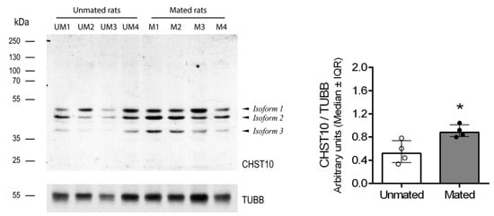 Mating increases the carbohydrate sulfotransferase 10 (CHST10) protein level in the oviductal mucosa of rats. Western blot of samples obtained from the oviductal mucosa of unmated (UM1-4) and mated (M1-4) rats. Biological replicates for each group, n = 4. The bar graph represents the intensities of the three CHST10 isoforms detected by the Western blot and normalized to that of tubulin β class I (TUBB). Interquartile range (IQR): Interquartile range. * p < 0.05, indicates significant differences.