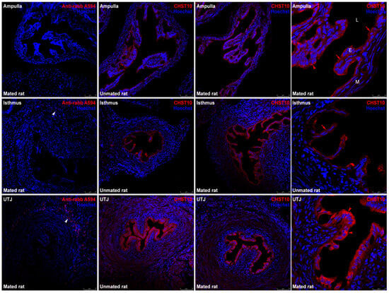 Expression of CHST10 in the rat oviduct. CHST10 was detected via immunofluorescence in oviductal sections obtained from unmated and mated rats. The panels show merged red and blue fluorescence. CHST10: red; and nuclear staining: blue. (First row) ampulla; (second row) isthmus; and (third row) utero-tubal junction (UTJ). The panels in the left column are the negative controls. White arrowheads: immune cells in negative controls; red arrowheads: CHST10 signal resembling the Golgi apparatus location; red arrows: CHST10 in the epithelium cytoplasm. L, Lumen; E, mucosa layer; M, muscular layer. Original magnification, 200× (scale bar, 75 μm). Only the right panels display the image at 630× magnification (scale bar, 25 μm). Images are representative of three independent experiments.