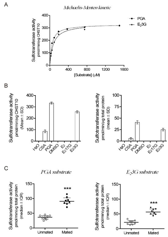 To measure sulfotransferase activity, we used both unmated and mated female rats. Sulfotransferase activity was measured using a Universal Sulfotransferase Activity Kit (R&D Systems, Minneapolis, MS, USA cat# EA003), and PAPS (R&D Systems, cat# ES019) was used as the donor substrate. PGA (Sigma-Aldrich, Saint Louis, MO, USA cat# P0501), E23G (Cayman Chemical, Ann Arbor, MI, USA, cat# 16155), and CSA (Sigma-Aldrich, cat# C9819) were used as positive acceptor substrates, and 17β-estradiol 17-[β-D-glucuronide] (E217G; Cayman Chemical, cat# 16156) and E2 (Cayman Chemical, cat# 10006315) were used as negative acceptor substrates. We also evaluated the substrate specificity of human recombinant CHST10 (R&D Systems, cat# 6140-ST) and compared the activity of this enzyme to the sulfotransferase activity detected in oviductal mucosa protein extracts.