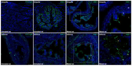 Expression of human natural killer-1 (HNK-1) moieties in the rat oviduct. Immunofluorescence images of the HNK-1 moiety in oviductal sections obtained from unmated and mated rats. The panels show merged green and blue fluorescence. HNK-1 moiety: green; nuclear staining: blue. (First row) ampulla; (second row) isthmus; original magnifications are 200× (scale bar, 75 μm) and 400× (scale bar, 25 μm). The square in the middle panels is the location of the magnified image displayed in the right panel, original magnification, 630× (scale bar, 25 μm). Green arrows: apical location of HNK-1 moieties in epithelial cells; green arrowhead: luminal location of HNK-1 moieties; yellow arrowhead: acrosome-intact sperm in the lumen; asterisks: HNK-1 moieties located in the trenches of the mucosal folds. L: lumen; E: mucosa layer; M: muscular layer.