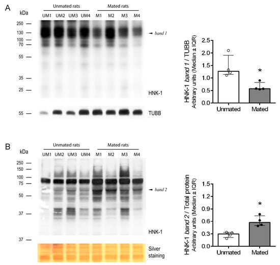 Mating changes the levels of HNK-1 glycoproteins in the oviductal mucosa of rats. (A) Western blotting via one-dimensional (1D) electrophoresis was used to evaluate HNK-1 glycoproteins in the cellular pool of proteins from the oviductal mucosa. Biological replicates for each group, n = 4. The bar graph presents the intensity of band 1 (130 kDa) normalized to that of TUBB. (B) Western blotting via 1D electrophoresis to evaluate HNK-1 glycoproteins in the secreted pool of proteins from the oviductal mucosa. Biological replicates for each group, n = 4. The bar graph shows the intensity of band 2 (55 kDa) normalized to that of the total proteins with molecular weights less than 37 kDa, as detected by silver staining of the nitrocellulose membrane. * p < 0.05, indicates significant differences.