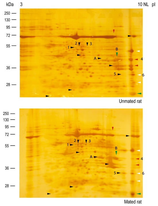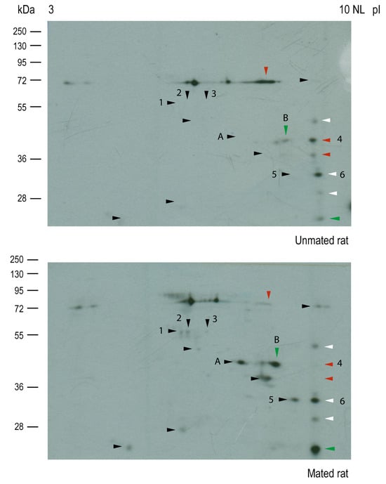 Then, Western blot analysis of the samples resolved by two-dimensional (2D) electrophoresis was conducted to isolate and identify the HNK-1 glycoproteins (Figure 6); however, samples from the cellular pool were not well-resolved; then, we only focused on HNK-1 glycoproteins from the secreted pool. Our 2D analysis of HNK-1 glycoproteins revealed that mating changed the synthesis and/or secretion of a group of secreted HNK-1 glycoproteins in the oviductal mucosa. Our results indicated that mating induced the appearance of 10 spots (black arrowheads), increased the intensities of 2 spots (green arrowheads), and decreased the intensities of 3 spots (red arrowheads). Three spots with similar intensities were selected as references (white arrowheads) for sample comparison (Figure 6, upper and lower panels). Band 2 (55 kDa) previously detected in Figure 5B was resolved as spot 1, spot 2, and spot 3 and was detected only in mated rats (Figure 6, lower panel), supporting the results obtained after 1D electrophoresis.