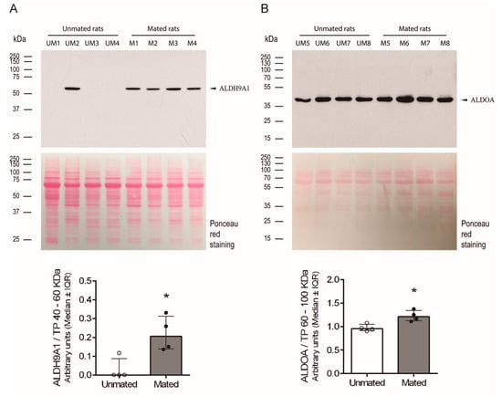Mating changes the levels of aldehyde dehydrogenase 9 family, member A1 (ALDH9A1) and fructose bisphosphate aldolase A (ALDOA) in the secreted pool of proteins from the oviductal mucosa of rats. (A) Western blot analysis of ALDH9A1 expression in samples (40 µg each) obtained from the oviductal mucosa of unmated (UM1-4) and mated (M1-4) rats (upper panel). Biological replicates for each group, n = 4. The bar graph represents the intensity of the unique ALDH9A1 band (arrowhead) normalized to the total protein (TP) intensity between 40 and 60 kDa, as detected by Ponceau red staining of the nitrocellulose membrane (lower panel). (B) Western blot analysis of ALDOA expression in samples (10 µg each) obtained from the oviductal mucosa of unmated (UM5-8) and mated (M5-8) rats (upper panel). Biological replicates for each group, n = 4. The bar graph represents the intensity of the unique band (arrowhead) normalized to the TP intensity between 60 and 100 kDa, as detected by Ponceau red staining of the nitrocellulose membrane (lower panel). * p < 0.05, indicates significant differences.