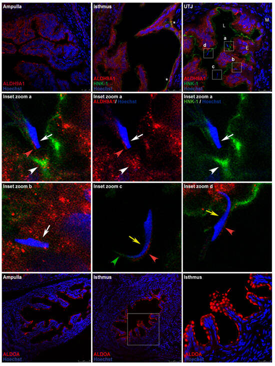 Immunofluorescence analysis of oviduct sections was used to localize ALDH9A1 and ALDOA in the oviductal mucosa. ALDH9A1 was detected on the luminal face of the epithelium in the ampulla and detected in the cytoplasm and cytoplasmic vesicles in the isthmus and UTJ. Double staining of ALDH9A1 (red signal) and the HNK-1 moiety (green signal) revealed that their signals were overlapping only in trenches created by the transverse mucosal folds in the isthmic region (Figure 9, first row, middle panel asterisk). Signal overlapping was also detected in the mucosa of the UTJ, closer to the membrane. We also found an acrosome-reacted sperm (Figure 9, second row, white arrow) that was apparently interacting with this signal-overlapping region in the mucosa (Figure 9, second row, white arrowhead), and another acrosome-reacted sperm (Figure 9, third row, left panel, white arrow) was found apparently crossing the oviductal mucosa. On the other hand, a free acrosome-intact sperm (Figure 9, third row, middle panel, yellow arrow) was detected in the lumen, and another acrosome-intact sperm (Figure 9, third row, right panel, yellow arrow) was apparently interacting with the oviductal mucosa, in a region in which the HNK-1 and ALDH9A1 signals did not overlap. Furthermore, we detected weak signals from ALDH9A1 in the acrosome’s principal segment domain of the acrosome-intact sperm (Figure 9, third row, middle and right panel, red arrowheads), and in the acrosome’s equatorial segment domain of the acrosome-reacted sperm (Figure 9, second row, left and middle panel, red arrowheads). Weak signals from HNK-1 moiety were only detected in the marginal segment domain of the acrosome in the free acrosome-intact sperm located in the oviductal lumen (Figure 9, third row, middle panel, green arrowhead). Finally, HNK-1 and ALDH9A1 weak signals were also detected in the middle piece of the sperm tail (Figure S1, green and red arrows, respectively). Additionally, tubulin β class I (TUBB), a marker of ciliated epithelia, was detected in the oviductal mucosa. Early after mating, ciliated epithelia are predominantly present in the ampulla, whereas they are scarce in the isthmus, mainly in the trenches created by the transverse mucosal folds, creating a striped pattern of ciliated cell clusters in the isthmus (Figure S2, right panel, green arrows).