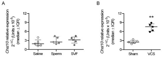RT-qPCR was used to compare the expression levels of Chst10 in oviductal mucosa samples from the VCS and sham control groups and among the saline, sperm, and SVF groups. Actb and Gapdh were used as reference genes to calculate the relative gene expression levels. Information regarding the total RNA isolation procedure, primer sequences, RT-qPCR conditions, and data analyses was reported previously [].