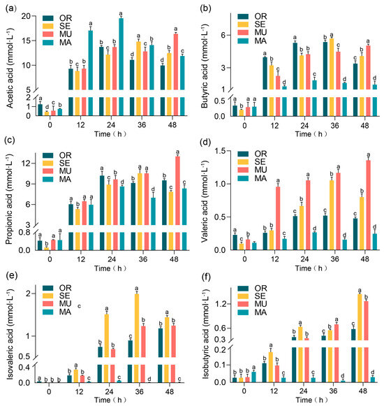 Overall, a relatively high increase in the concentration of all SCFAs measured was observed in the MU group showed, especially in the later stages of the experiment (36–48 h). This result may indicate the more favorable conditions of the MU group for the production of SCFAs. The OR group exhibited the lowest concentrations of SCFAs, and those of the SE and MA groups were in between.