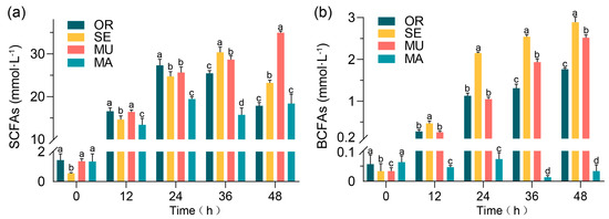 All groups had similar initial concentrations of the total SCFAs (Figure 2a). The MU group showed a slightly higher concentration of SCFAs than the other groups at 24 and 36 h and a higher concentration of the total SCFAs than the OR group at 48 h. At the measurement point of 48 h, the concentration of SCFAs in the MU group significantly exceeded those of the other three groups. The value reached 35.0 ± 0.385 mmol·L−1, which is 92.62% and 89.84% higher than those of the OR and MA groups, respectively. The concentration of SCFAs in the MU group generally showed a steadily increasing trend, whereas the increase in concentration was unstable in the other groups, with a common pattern indicating an increase and then a decrease. The MA group, which had the lowest SeM content, showed the lowest concentration of branched-chain fatty acids (BCFAs), and those of the SE and MU groups increased with fermentation time (Figure 2b).