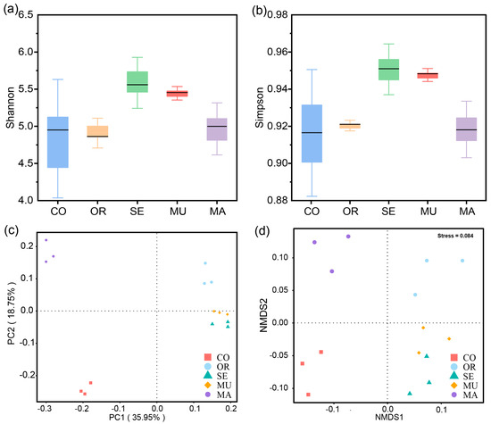 To assess the α-diversity, this study utilized Shannon’s and Simpson’s indices, which quantify the phylogenetic diversity by integrating microbial richness (number of species) and evenness (relative abundance distribution) within the gut community. To assess the β-diversity, this study employed a principal coordinates analysis (PCoA) and non-metric multidimensional scaling (NMDS) to visualize microbial community dissimilarities between experimental groups.