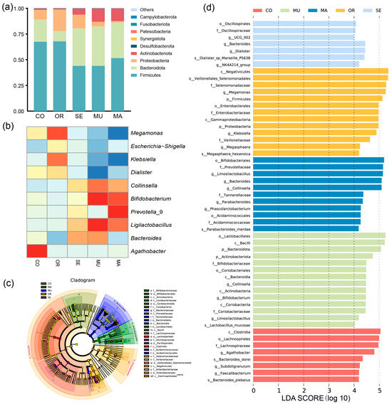 The histogram depicting the phylum-level species relative abundance (Figure 4a) illustrates the gut microbial community composition across experimental groups. In this study, the CO group and the OR, SE, MU, and MA experimental groups comprised several dominant phyla, including Actinobacteriota, Proteobacteria, Bacteroidota, and Firmicutes. Firmicutes was dominant in all groups and had a relative abundance exceeding 44.03% of the total bacterial sequences. The OR group exhibited the highest relative abundance at 67.87%, and the CO group showed a close value of 67.48%. The MU group had the lowest relative abundance of Firmicutes (53.80%). Bacteroidota reached the highest relative abundance in the MU group (38.46%), and the value decreased to the lowest in the OR group, at 10.12%. The highest relative abundance of Proteobacteria was observed in the OR group (20.92%) and the lowest in the MA group (1.27%). This phylum is considered a typical marker of intestinal dysbiosis, in which most of the bacteria, such as Escherichia coli and Salmonella, are pathogenic to humans. Only the MA and MU groups had high levels of Actinobacteria, most of which are beneficial to humans (Bifidobacterium and Lactobacillus). The MU group contained the lowest ratio of Firmicutes to Bacteroidota (1.14), whereas the OR group exhibited the highest ratio (6.71). Compared with the MU group, the CO and OR groups showed higher corresponding ratios of 172.03% and 488.29%, respectively. After 48 h of fermentation, the yeast with a high SeM content significantly promoted the growth of Bacteroidota, as indicated by the changes in microbial abundance.
