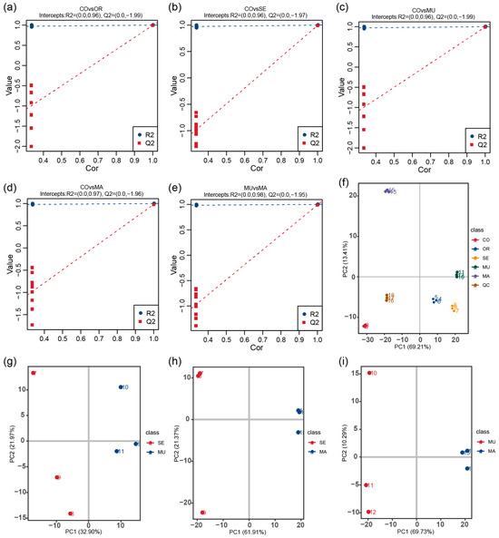 (a–e) PLS-DA validation plots; (f–i) PCA score plot. The x-axis (PC1) and y-axis (PC2) represent scores for the first and second principal components, respectively. Scatter points colored by experimental groups depict sample distribution (f–i). n = 3 per treatment.