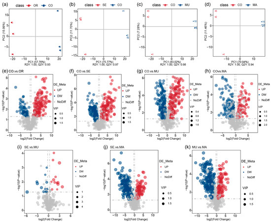 (a–d) PLS-DA score scatter plots; and (e–k) volcano plots of differential metabolites. The volcano plot provides an intuitive representation of the overall distribution of differential metabolites. The x-axis represents the fold change of metabolites between different groups (log2(Fold Change)), and the y-axis represents the significance level of the differences (−log10(p-value)). Each point in the volcano plot corresponds to a metabolite, with significantly upregulated metabolites shown as red points, and significantly downregulated metabolites shown as blue points. The size of the points indicates the VIP value. n = 3 per treatment.