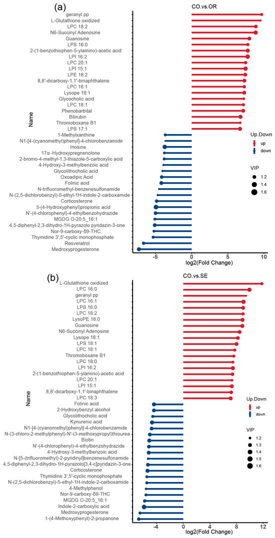 Stem plots of differential metabolites: (a) CO vs. OR; and (b) CO vs. SE. A stick plot was generated based on the differential metabolites obtained from the group comparisons, which clearly illustrates the upregulation, downregulation, and the metabolites with large fold change variations. The Fold Change values of the differential metabolites were log-transformed with base 2, and the top 20 upregulated and downregulated metabolites were selected for display in the stick plot. The color of the points represents the direction of regulation: blue for downregulated and red for upregulated. The length of the bars represents the size of the log2(Fold Change), while the size of the points corresponds to the VIP value. n = 3 per treatment.
