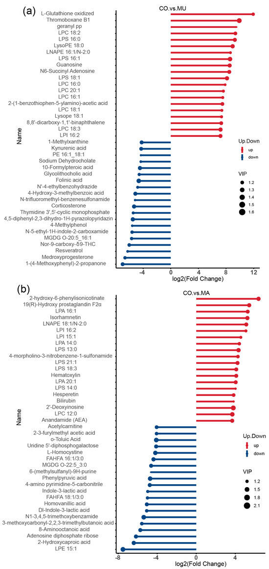 Stem plots of differential metabolites: (a) CO vs. MU; and (b) CO vs. MA. A stick plot was generated based on the differential metabolites obtained from the group comparisons, which clearly illustrates the upregulation, downregulation, and the metabolites with large fold change variations. The Fold Change values of the differential metabolites were log-transformed with base 2, and the top 20 upregulated and downregulated metabolites were selected for display in the stick plot. The color of the points represents the direction of regulation: blue for downregulated and red for upregulated. The length of the bars represents the size of the log2(Fold Change), while the size of the points corresponds to the VIP value. n = 3 per treatment.