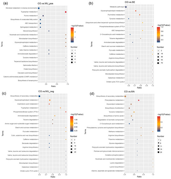 Bubble plots of KEGG enrichment: (a) CO vs. MU_pos; (b) CO vs. SE; (c) CO vs. MU_neg; and (d) CO vs. MA. In the figure, the x-axis represents the ratio of the number of differential metabolites in a given metabolic pathway (x) to the total number of metabolites identified in that pathway (y). A larger value indicates a higher degree of enrichment of differential metabolites within the pathway. The color of the points corresponds to the P-value from the hypergeometric test, with smaller values indicating higher reliability and greater statistical significance. The size of the points represents the number of differential metabolites in the corresponding pathway, with larger points indicating more differential metabolites in that pathway. n = 3 per treatment.