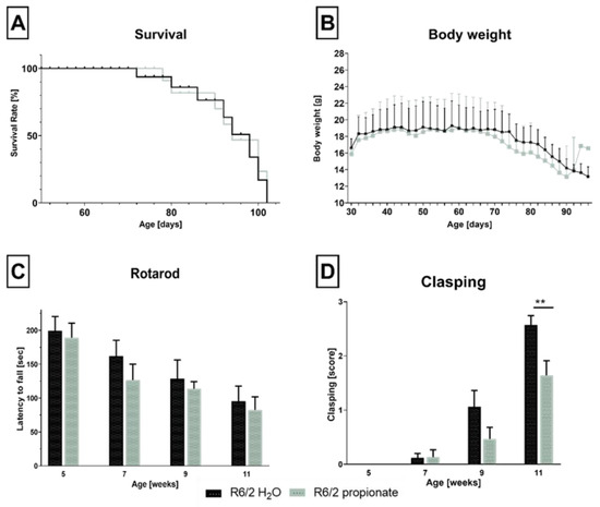 Propionate treatment did not affect signs of clinical progression but ameliorated clasping behavior in R6/2 mice. (A). Kaplan-Meier survival curve. Median survival for control mice (n = 10) was 89 days and for treated mice (n = 14) 88 days. No prolonged survival rate was observed for propionate-treated R6/2 mice. Kaplan-Meier analysis with a log-rank test was performed as a test for significance. (B). R6/2 mice gain weight until the age of 50 days and start losing weight at 65 days of age (R6/2-H2O 18.76 ± 0.176, R6/2-propionate 18.69 g ± 0.185). No difference between both groups was measured. Due to the sudden natural death of animals during survival study, n-number in both groups varies R6/2-propionate n ≥ 14, R6/2-H2O n ≥ 10. Unpaired t-test with individual variance for each row. (C). Rotarod performance in the survival group. Performance declined with disease progression in treated and control mice. R6/2-propionate n ≥ 14, R6/2 H2O n ≥ 10. Two-way ANOVA with Bonferroni’s multiple comparisons test. (D). Clasping was less severe in propionate-treated mice over time, with significant differences at eleven weeks of age (** p = 0.003) compared to water-treated mice. R6/2-propionate n ≥ 18, R6/2 H2O n ≥ 15. Two-way ANOVA with Bonferroni’s multiple comparisons test. Data are shown as mean ± standard error of the mean (SEM).