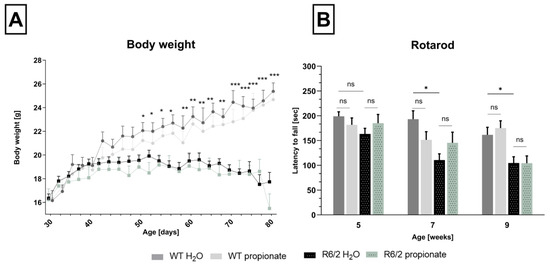 Wild-type control group in comparison to R6/2 mice. (A). Difference in body weight (wildtype control mice vs. R6/2 mice) became significant starting at the age of 50 days (Mean at 50 days of age R6/2-H2O 18.76 ± 0.176, R6/2-propionate 18.69 g ± 0.185, WT-H2O 21.84 g ± 0.5, WT-propionate 21.10 g ± 0.45, WT-H2O vs. R6/2-H2O * p = 0.023, WT-H2O vs. R6/-propionate * p = 0.048) With increasing age, differences in weight development become more pronounced (** p < 0.01, *** p < 0.001.) (B). Rotarod performance significantly declined in water-treated R6/2 mice at the age of 7 weeks (WT H2O vs.R6/2 H2O * p = 0.0004) and 9 weeks (WT H2O vs. R6/2 H2O * p = 0.008). Propionate treatment did not influence motor performance (ns = not significant). Two-way ANOVA with Bonferroni’s multiple comparisons or multiple unpaired t-tests with Bonferroni’s correction was performed, respectively. Data are expressed as mean ± SEM.