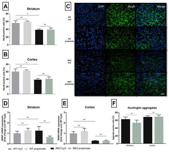 Propionate has been shown to exert neuroprotective potential in different models for diseases like Alzheimer’s disease (AZ) [46] or MS [42]. Therefore, neuronal marker (NeuN) immunostaining and mRNA levels of brain derived neurotrophic factor (BDNF) were examined. In R6/2 mice, NeuN immunostaining revealed a significant decline in the number of neurons compared to wild-type littermates. Similarly, treatment with propionate showed no protective effect on neuronal loss (Figure 3A,B). Figure 3C exemplarily displays immunofluorescent staining of neuronal marker NeuN in the cortical area of wild-type and R6/2 mice, where a reduction is evident in transgenic mice. Striatal BDNF-mRNA level remains unchanged in R6/2 mice compared with WT littermates (Figure 3D). In the cortex, however, BDNF-mRNA level decreased significantly in R6/2 mice compared with WT littermates. In line, propionate treatment failed to rescue cortical BDNF reduction in R6/2 mice (Figure 3E). Aggregation of mutated Htt in the CNS correlates with HD’s neurological symptoms [47]. We closely quantified the number of cells containing huntingtin aggregates in the striatum and the motor cortex. Both areas comprise a similar percentage of aggregate positive cells, yet propionate treatment showed no influence on aggregation revealed by EM48 immunostaining (Figure 3F).
