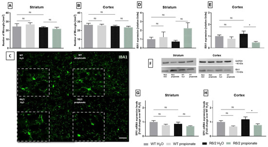 Therefore, we proceeded to quantify whole IBA1 levels by Western blot analysis. Total IBA1 protein levels were not upregulated in R6/2 mice compared to wild-type littermates in striatal and cortical samples (Figure 4D,E). Yet, lower IBA1 expression was observed in the cortex of propionate treated R6/2 mice compared to water treated R6/2 mice. (Figure 4E). Figure 4F shows exemplary western blot bands. To further quantify microglia activation, expression of microglia-specific transcription factor PU.1/SPI1 was analyzed by rtPCR. In previous studies, SPI1 was related to inflammatory responses in HD [48]. Analysis revealed no differences in mRNA levels between striatal samples of wild-type and R6/2 mice. Also, propionate treatment showed no effect in R6/2 mice (Figure 4G). A similar pattern was observed in cortical samples, where R6/2 mice exhibited no upregulation of SPI1 mRNA expression. However, a decrease in SPI1 mRNA levels was observed in propionate-treated R6/2 mice compared to H2O-treated R6/2 mice (p = 0.0352) (Figure 4H).