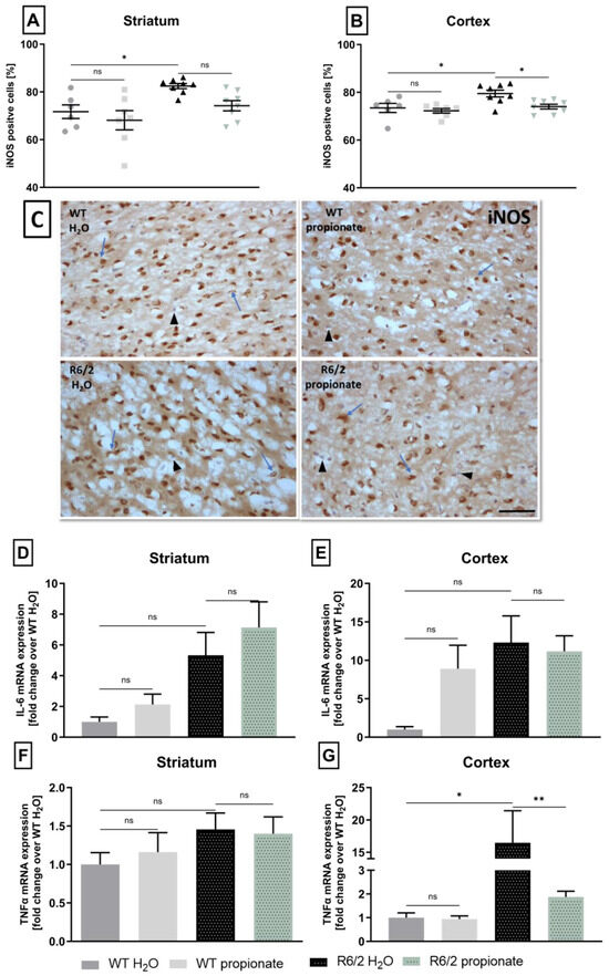 Subsequent analysis of pro-inflammatory markers such as iNOS, and the cytokines TNFα and IL-6 was performed to further explore the inflammatory environment in the CNS and the effect of propionate in R6/2 mice. In neuroinflammation, iNOS is typically upregulated and serves as a marker for the extent of inflammation since the expression levels rise with prolonged inflammatory conditions [68]. In our experiments, iNOS was increased in the brains of R6/2 mice seen by elevated numbers of iNOS-positive cells, confirming pro-inflammatory conditions within striatal and cortical areas. However, iNOS expression was shown to be reduced by propionate in R6/2 mice, supporting its anti-inflammatory potential. In line with previous findings, this reduction was evident in the cortex, while a reduction in the striatum was not significant. Subsequently, pro-inflammatory cytokine production was analyzed. In the striatum, TNFα mRNA expression levels were consistent with the previously examined markers and showed no signs of a pro-inflammatory environment. However, in the cortex, TNFα expression was significantly elevated in R6/2 mice, indicating a pro-inflammatory environment. Treatment with propionate led to a reduction in TNFα levels, supporting previous findings that propionate exerts an anti-inflammatory effect in the cortex in R6/2 mice.