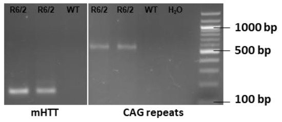 Ovarian-transplanted (OT) hemizygous female mice transgenic for the 5′ end of the human HD gene with a repeat length of approximately 160 ± 5 were purchased from Jackson Laboratories (Bar Harbor, ME, USA, Stock 002810) were bred with male C57BL/6J-mice (Charles River, Köln, Germany) to obtain R6/2 mice of the F1-generation. For further breading heterozygous R6/2-males were backcrossed with C57BL/6J-females. Hemizygous age-matched mice of the F2-generation with a verified CAG-repeat length of 160 ± 5 and both sexes were used. Animals were housed in mixed genotype single-sex cages under standard conditions with a 12-h light/dark cycle at 22 °C with ad libitum access to water and food, fitted with houses and nesting material. Healthy littermates served as the control group. Ear tissue from 15–17 days old mice was obtained to detect expression of mutated Htt as well as CAG-repeat length with polymerase-chain-reaction. DNA was extracted with the KAPA Express Extract (Roche, Basel, Switzerland) and PCR was performed with the KAPA2G fast HotStart genotyping mix (Roche) according to manufacturers’ protocols. Bands were identified at ~170 bp for mutated Htt and ~600 bp for CAG-repeats (Figure 6). Primers, as listed in Table 1, were purchased from Microsynthesis (Balgach, Switzerland).