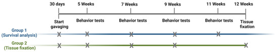 All mice were subjected to behavior testing at the age of 5, 7, and 9 weeks. Mice of survival study accessed tests additionally at 11 and 12 weeks, if physiologically permissible (Figure 7). For all animals, the same testing conditions were granted. Tests were performed in the early afternoon and mice adapted conditions 1 h prior to testing. Motor coordination and balance were tested on a five-station mouse rotarod (Ugo Basile, Biological Research Apparatus, Varese, Italy). Mice were first trained at the age of 4 weeks at a constant speed of 10 rpm with a maximum of 240 s. For experimental testing, settings were changed to an acceleration of 4 to 40 rpm over a maximum period of 240 s. The latency to fall was measured twice (with a minimum pause of 45 min) on the testing day. For dyskinesia progression, hind limb clasping [45] was observed by lifting mice by the tail upside down for a maximum of 45 s about 40 cm above the ground. A three-step scoring system based on time taken to clasp was applied as described earlier [80]. Clasping was rated positive when both hind limbs were touching.