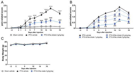 We investigated the potential preventive effects of the alkalinizing agent K/Na citrate on PTX-induced mechanical allodynia in mice. A single injection of PTX (5 mg/kg; intraperitoneal, i.p.) caused a significant increase in pain-related scores compared with those of sham mice from day 3 until day 16, which peaked on day 14 (Figure 1A, day 14, 0.18 ± 0.06, sham-vehicle group; 1.75 ± 0.07, PTX-vehicle group, p < 0.0001). The repeated administration of K/Na citrate (2 g/kg/day; per os, p.o.) significantly suppressed PTX-induced mechanical allodynia on days 3, 5, 7, 10, 12, 14, and 18 (Figure 1A, day 14, 0.69 ± 0.11, PTX-K/Na citrate group, p < 0.0001). This antiallodynic effect of K/Na citrate was found to be dose-dependent over the course of PTX-induced allodynia (Figure 1B). PTX injection or K/Na citrate administration did not alter the body weights of mice (Figure 1C). In addition, previous studies have demonstrated that K/Na citrate does not have a sedative effect [26]. Therefore, the observed analgesic effect of K/Na citrate is unlikely to be attributed to sedation or the body weight loss induced by its administration. Thus, in subsequent experiments, the dose of 2 g/kg/day, which most effectively suppressed mechanical allodynia, was employed.