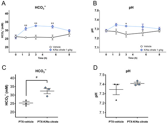 Blood HCO3− concentrations and pH after oral administration of K/Na citrate. (A,B) Blood HCO3− concentrations (A) and blood pH (B) in healthy C57BL/6 mice after a single administration of K/Na citrate (1 g/kg, p.o.), measured at different time points post administration (0, 1.5, 3, 5.5, and 8 h). Data are presented as mean ± SEM (n = 3–4). * p < 0.05, ** p < 0.01 vs. vehicle (two-way ANOVA with post hoc Holm–Sidak multiple comparison test). (C,D) Blood HCO3− concentrations (C) and pH (D) in PTX-induced CIPN mice after repeated administration of K/Na citrate (2 g/kg/day, p.o.), measured on day 14 at 2 h post administration. Data are presented as mean ± SEM (n = 3). # p < 0.05 vs. PTX-vehicle (Student’s t-test).