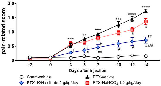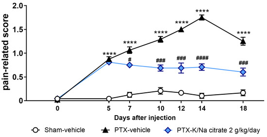 We also investigated the potential therapeutic effects of K/Na citrate on mechanical allodynia by administering K/Na citrate after the development of PTX-induced mechanical allodynia in mice. Mice were given a single injection of PTX (5 mg/kg, i.p.) or vehicle on day 0. K/Na citrate (2 g/kg/day, p.o.) or vehicle was administered twice daily from days 5 to 18. Consistent with previous findings, the PTX treatment led to an increase in the pain-related scores on day 5 (Figure 8, 0.9 ± 0.1, PTX-vehicle group; 0.0 ± 0.0, sham-vehicle group, p < 0.0001). When K/Na citrate administration commenced on day 5, the PTX-vehicle group showed a continued increase in their pain-related scores until day 14, whereas the PTX-K/Na citrate group maintained pain-related scores similar to those on day 5 (Figure 8, day 14, 1.8 ± 0.1, PTX-vehicle group; 0.7 ± 0.1, PTX-K/Na citrate group, p < 0.05).