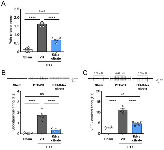 Effect of repeated oral administration of K/Na citrate on spontaneous firing and vFF-evoked firing in superficial dorsal horn neurons in PTX-treated mice. (A) Pain-related scores in PTX-induced CIPN model mice with or without K/Na citrate treatment on day 13. (B,C) Representative traces and quantitative evaluation of spontaneous firing (B) and vFF-evoked firing (C) in superficial dorsal horn neurons in mice receiving each treatment. Data are presented as mean ± SEM (n = 5) (the total number of neurons was 25). ** p < 0.01, **** p < 0.0001 (one-way ANOVA with post hoc Holm–Sidak multiple comparison test).