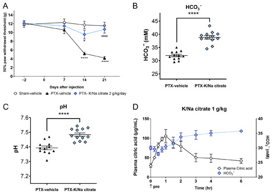 We investigated whether K/Na citrate could alleviate the allodynia induced by repeated PTX injection in rats. Mechanical allodynia was induced by administering PTX (2 mg/kg, i.p.) on four alternate days (days 0, 2, 4, and 6) in rats, resulting in a gradual decrease in the withdrawal threshold of the hind paw to mechanical stimulation on day 14 (5.18 ± 0.33 g, PTX-vehicle group; 11.71 ± 0.83 g, sham-vehicle group, p < 0.0001) and day 21 (4.18 ± 0.34 g, PTX-vehicle; 11.53 ± 0.81 g, sham-vehicle group, p < 0.0001) (Figure 5A). K/Na citrate (2 g/kg/day, p.o.) was administered twice daily from days −2 to 22, leading to a significant suppression of mechanical allodynia on days 14 (9.55 ± 0.98 g, PTX-K/Na citrate group, p < 0.05) and 21 (10.77 ± 0.86 g, PTX-K/Na citrate group, p < 0.0001) (Figure 5A). In the PTX-induced CIPN rats, the repeated administration of K/Na citrate significantly increased blood HCO3− concentrations (Figure 5B, 38.8 ± 0.7, PTX- K/Na citrate; 32.0 ± 0.5, PTX-vehicle group, p < 0.0001) and blood pH (Figure 5C, 7.48 ± 0.01, PTX- K/Na citrate group; 7.39 ± 0.01, PTX-vehicle group, p < 0.0001) on day 21 at 3 h post administration; this is consistent with the effects observed in PTX-induced CIPN mice.