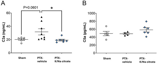 Effect of repeated oral administration of K/Na citrate on the concentrations of complement component anaphylatoxins C3a and C5a in rat plasma. (A) C3a and (B) C5a rat plasma complement component levels on day 22 in rat PTX-treated model measured using an enzyme-linked immunosorbent assay (ELISA) kit. Data are presented as mean ± SEM (n = 4–8). * p < 0.05 (one-way ANOVA with post hoc Tukey–Kramer multiple comparison tests).