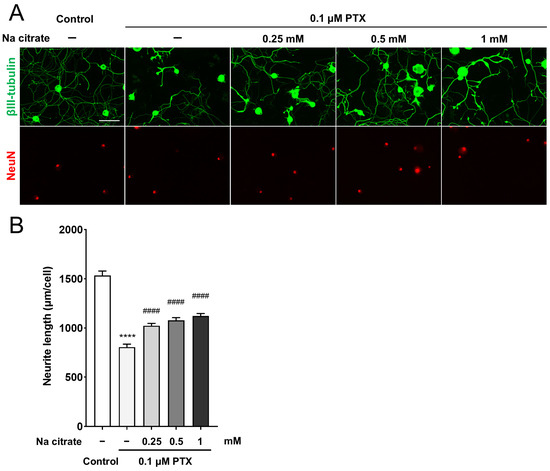Effect of Na citrate on neurite outgrowth of primary adult rat DRG neurons. (A) Representative images of βIII-tubulin (green) and NeuN (red) immunostaining of adult rat DRG neuron cultures exposed to 0.1 µM PTX for 24 h in the presence or absence of Na citrate. Scale bar: 100 µm. (B) Total neurite outgrowth in cultures with each treatment. Data are presented as mean ± SEM (n = 14 replicate cultures). **** p < 0.0001 vs. control, #### p < 0.0001 vs. 0.1 μM PTX (one-way ANOVA with post hoc Tukey–Kramer multiple comparison tests).