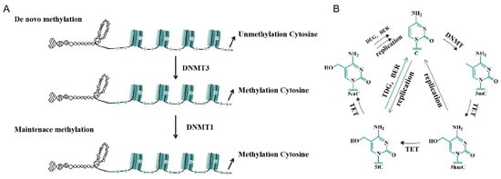 Mammalian DNA methylation patterns are established and maintained by DNA methyltransferases (DNMTs), including DNMT1, DNMT3A, and DNMT3B, along with the accessory protein DNMT3L. Research indicates that DNMT3A exhibits greater activity on unmethylated DNA substrates compared to semi-methylated DNA [], and DNMT3A [], DNMT3B, and DNMT3L play essential roles in the initial establishment of DNA methylation patterns. DNMT1, which has a higher affinity for semi-methylated DNA than for unmethylated DNA [,], ensures the faithful maintenance of established methylation patterns [] (Figure 1A).