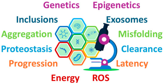 Molecular and cellular mechanisms in MSA pathophysiology—the fundamental mechanisms implicated in the pathophysiology of MSA include α-syn aggregation and toxic species formation, the development of glial cytoplasmic inclusions in oligodendrocytes, and disruptions in cellular energy pathways driven by mitochondrial dysfunction. Additionally, genetic and epigenetic factors, protein aggregation and misfolding pathways (proteostasis and clearance), along with the role of ROS (reactive oxygen species) and exosomes, and the interplay between neurodegeneration progression and latency are highlighted as interconnected contributors to disease development.
