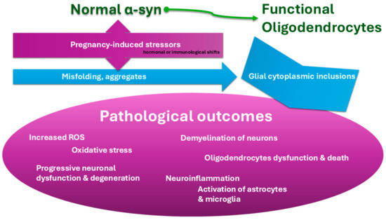 α-syn aggregation and pathological outcomes. Flow diagram representing how α-syn accumulation affects oligodendrocytes, leading to MSA pathology, potentially accelerated by pregnancy-induced stress factors.