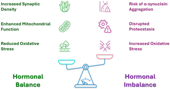 Balancing hormonal effects on neuronal health: illustration of hormonal influence on neurological conditions. Pregnancy-related hormones can exert protective effects on neuronal health, yet under conditions of imbalance, may increase vulnerability to neurodegenerative processes.