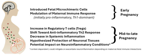 Microchimerism, resulting from bidirectional cellular trafficking between mother and fetus, establishes long-term immunological consequences [51]. The impact extends beyond pregnancy due to the persistence of fetal cells in maternal tissues and maternal cells in offspring representing an intriguing aspect of pregnancy-induced immune modulation with implications for long-term health outcomes [52]. Fetal microchimerism, wherein fetal cells persist in maternal tissues, has been implicated in autoimmune disorders such as systemic lupus erythematosus and rheumatoid arthritis [53]. Similarly, studies suggest fetal microchimeric cells may traffic to maternal injury sites and differentiate into tissue-specific cells, such as cardiomyocytes, in response to damage [54]. These findings raise the possibility that fetal microchimerism might modulate neuroinflammatory and repair processes in neurodegenerative diseases, including MSA, particularly during pregnancy [55,56,57]. See Figure 4 for a simplified visual presentation of influence of fetal microchimerism on maternal immune modulation during pregnancy.